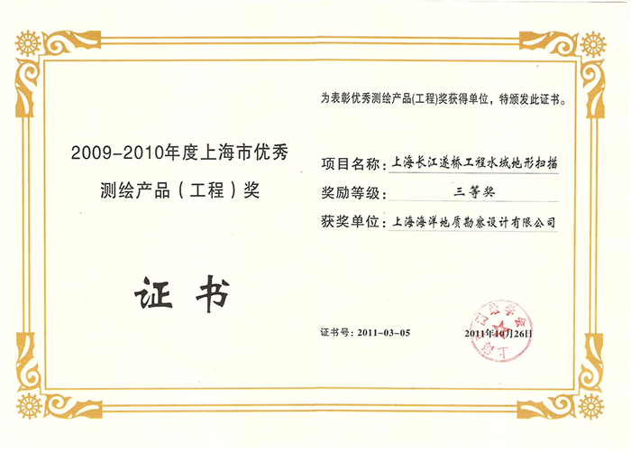 《上海長江隧橋工程水域地形掃描》榮獲2009-2010年度上市優(yōu)秀測繪產(chǎn)品(工程)三等獎